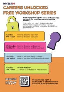 InvestIn are running a series of free interactive workshops, Careers Unlocked, giving students the opportunity to hear directly from experienced industry professionals about what it really takes to break into some of the world’s most competitive careers. These will be held on the following dates:
